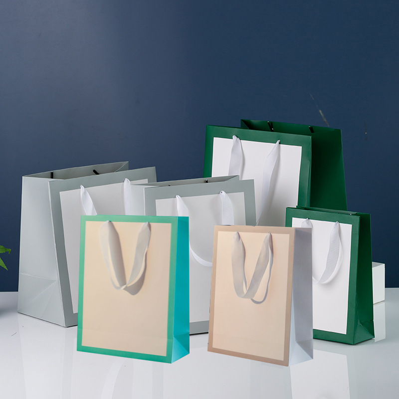 2025 新カラーブロックボーダー紙袋包装ギフトホワイトカードラミネート袋ブランクスポット厚みのある袋