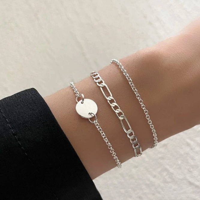 日韓風シンプルで洗練された小さな丸いファッションブレスレットセット銀色の光沢チェーンの幾何学ブレスレット3点セット
