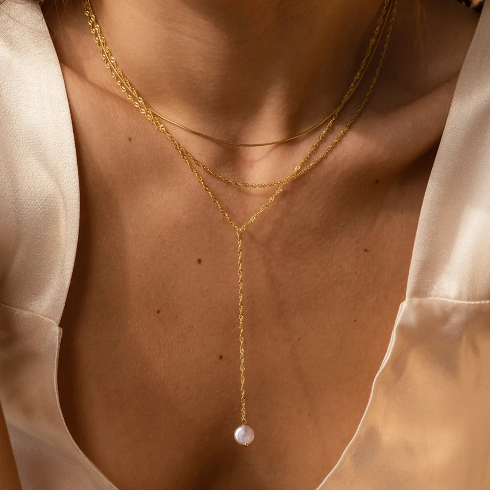 欧米の国境を越えたボヘミアン風は、ツイストチェーンの鎖の首飾りの女性のシンプルな真珠のペンダントのネックレスを重ねている