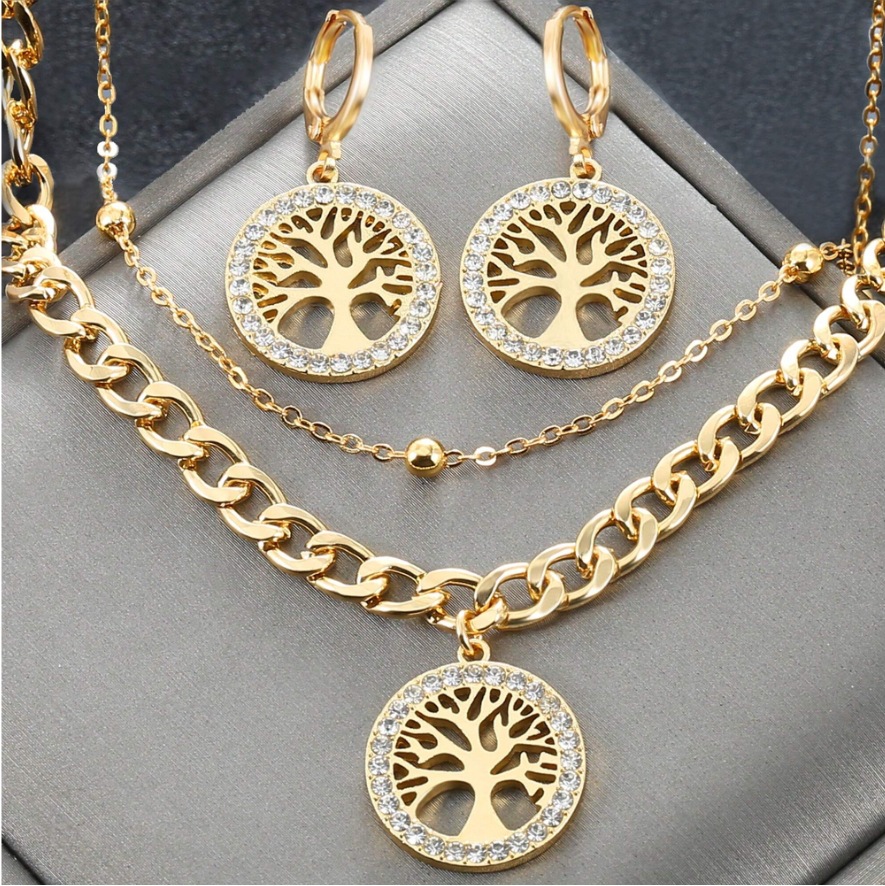 ヨーロッパとアメリカのトレンディな二層フルダイヤモンドラウンドタッセルライフツリー鎖骨ペンダントネックレスイヤリングセット装飾品女性用