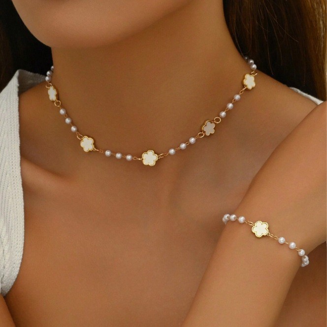 欧米のクロスボーダーのアクセサリーは真珠の手作りチェーンの五弁の花のネックレスのブレスレットの女性のファッションのアクセサリーのスーツをまねます。