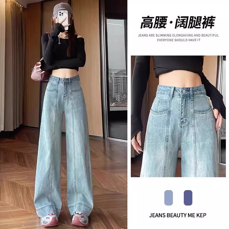 水色の広脚ジーンズ女性春2025新型高腰隠れ肉弾力分デザイン感モップズボン