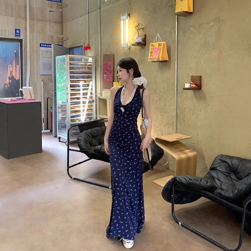 甘いギャルレースのつなぎ合わせデザイン感のある首のストラップのワンピース2025夏の新型の花の長いスカートの女性