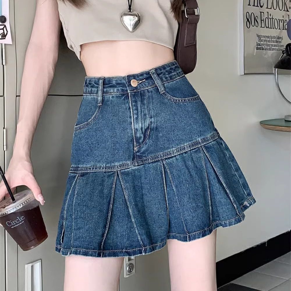 レトロハイウエストデニムプリーツスカート女性のための 2025 夏の新しいスタイル小柄な痩身 A ライン露出防止スカート