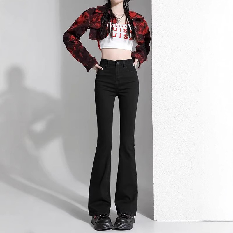 新商品のレトロ弾力ガードルの女性の馬蹄のズボンの小さい背の高い腰の薄い青色の修身のラッパのズボン