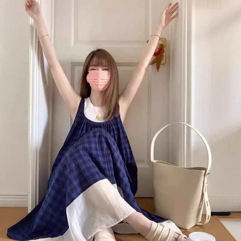 ブルーチェック柄サスペンダードレスレディース夏フレンチスタイル小柄ソルトスイートベストロングスカート
