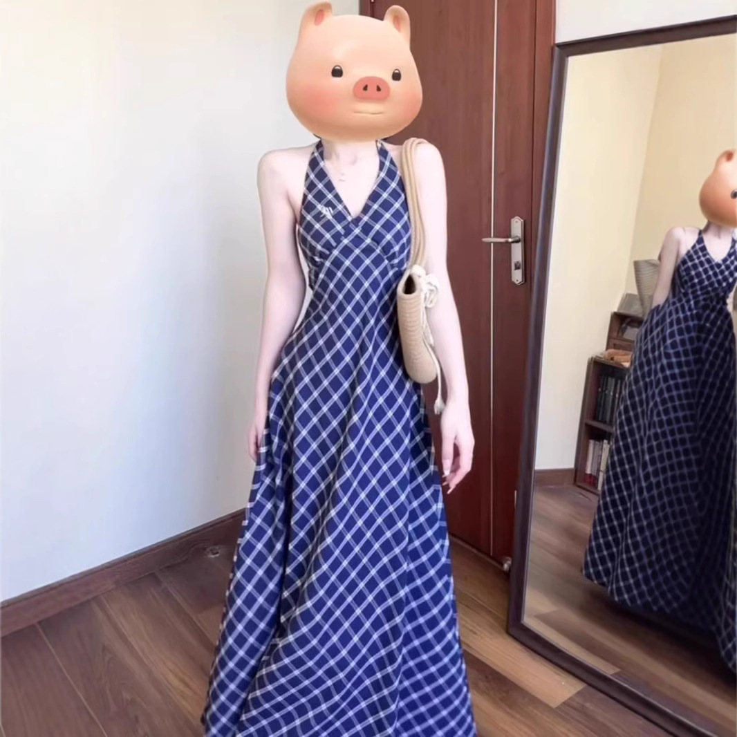 レトロな格子縞の首のワンピースの女性2025夏のギャルのリゾート風は腰を収めてやせている気質のストラップの長いスカートを現します。