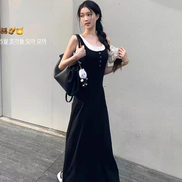 偽の2つの黒いストラップのワンピースの子供の夏の2025新型のナシの形の体つきのフランスの気質のベストのロングスカート