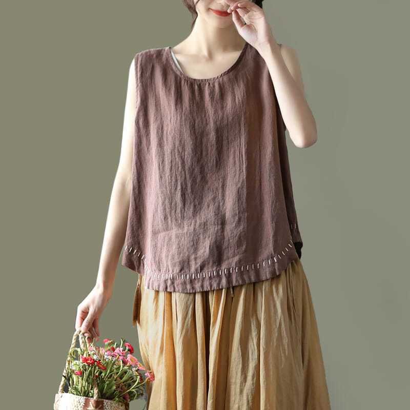 文芸の大きいサイズの純色の綿と麻の縁の刺繍のベストtシャツの女性の夏の新しいゆったりしているカジュアルな百合の袖なしの上着