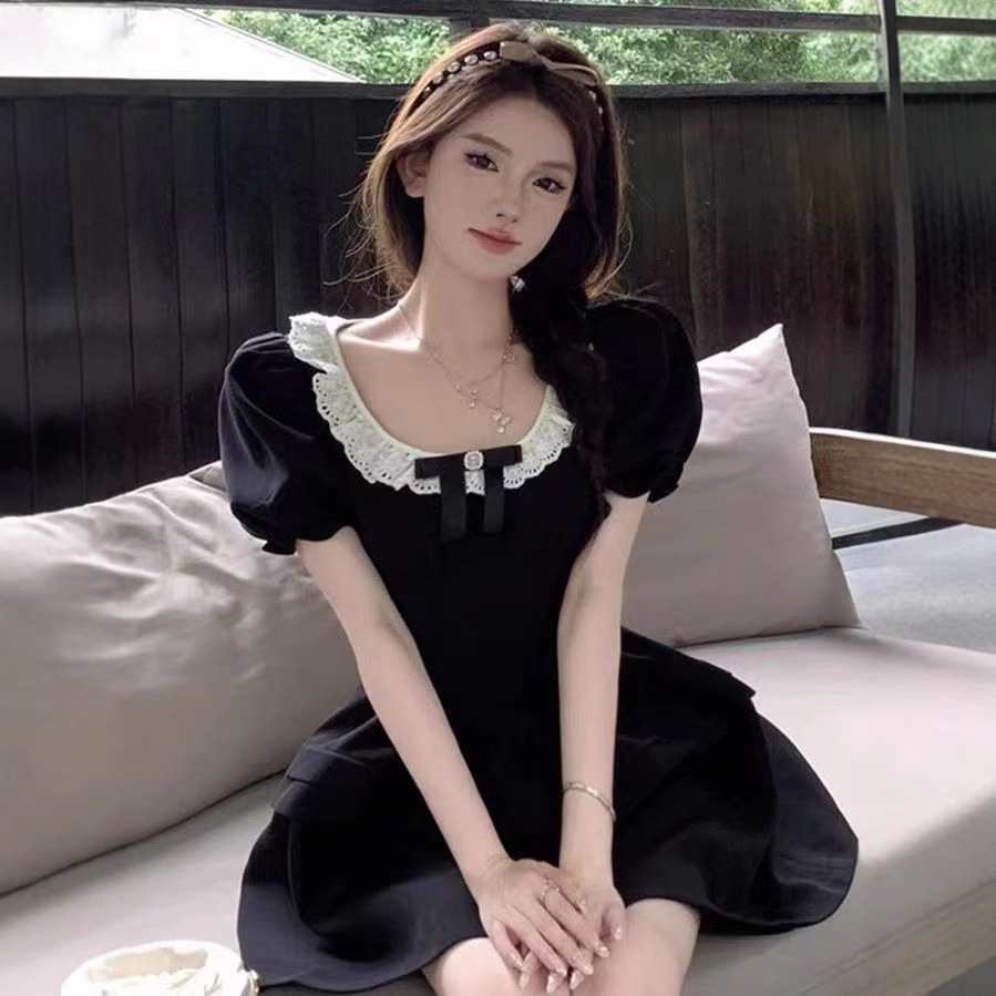 フレンチ高级感ヘップバーン风千金感小黒スカートレディース夏小大衆角襟蝶結びバブル袖ワンピース