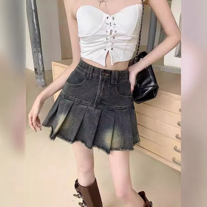 ホットガールレトロプリーツデニムスカート女性のための 2025 新しい夏ハイウエスト A ライン露出防止ヒップカバーショートスカート