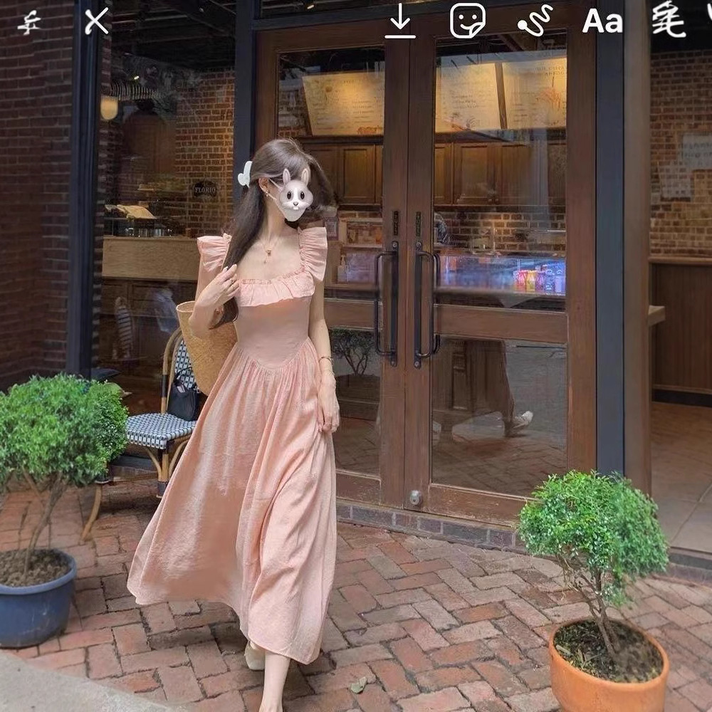 ハスの葉の縁の方襟の小さい飛袖のストラップワンピースの女性の夏の韓系の優しい風のきれいな気質は腰の長いスカートを収めます。