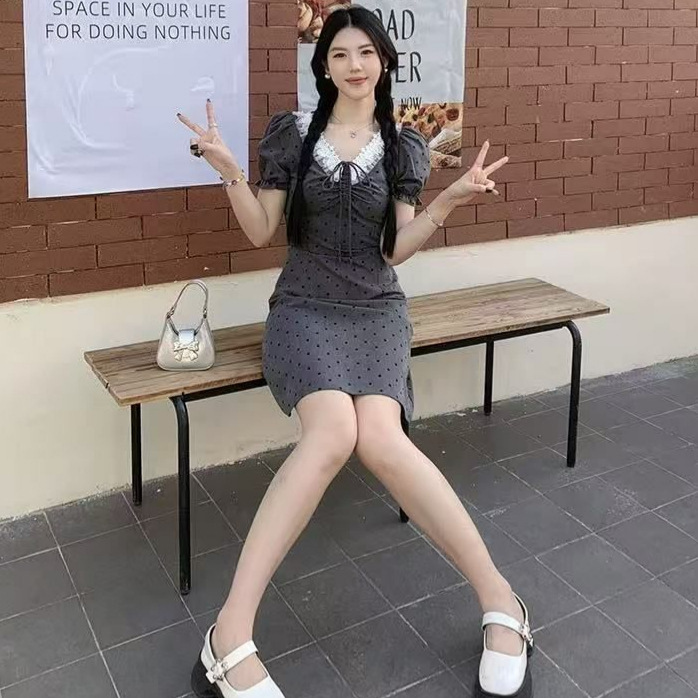 レースフレンチヘボン風グレー高級半袖ワンピース女性夏の梨の形は腰を収めて痩せています。