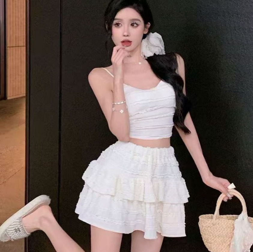 女性用カジュアルスーツ 2025 新しいスタイルの小柄でセクシーで美しいキャミソール白いショートスカート 2 点セット