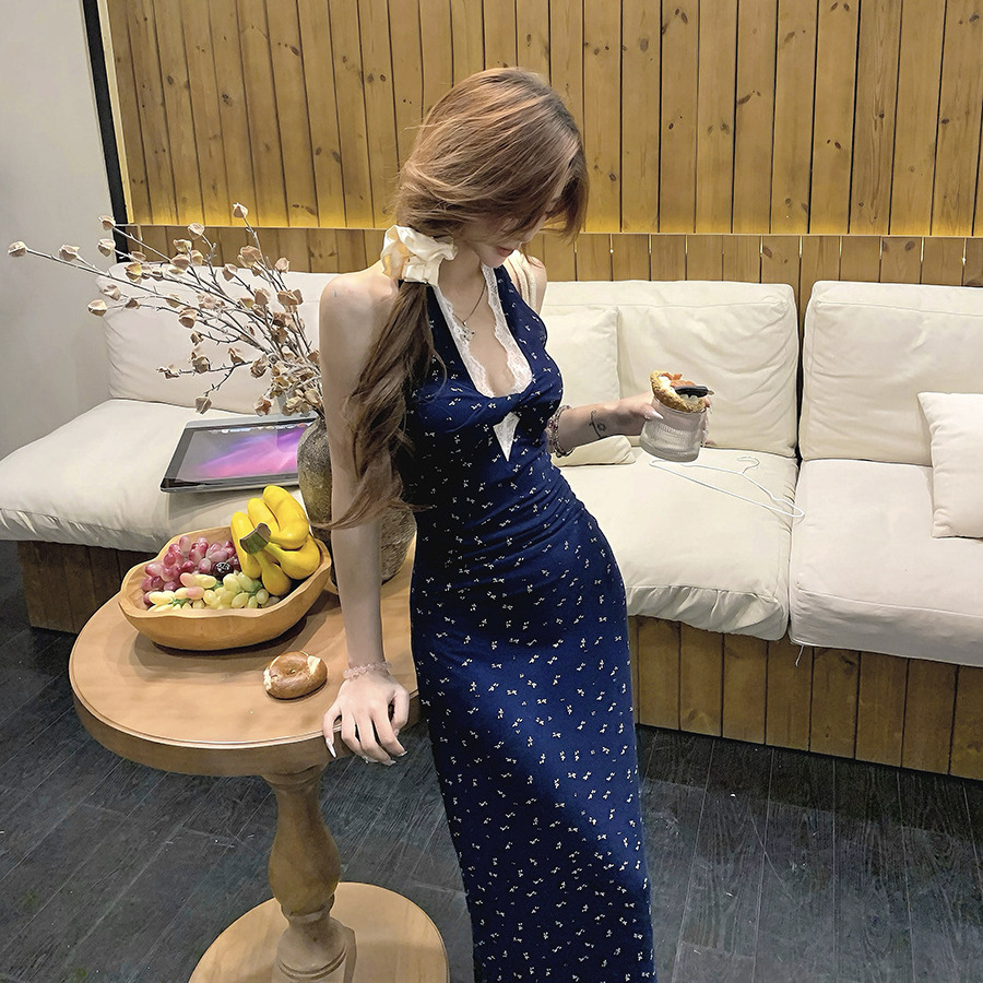 フランス式首掛け腰砕花ストラップワンピース女性夏小衆デザイン感ギャルレース