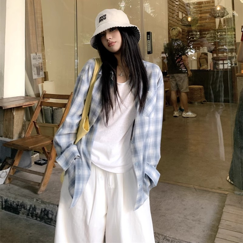怠惰な風の青い格子のシャツの女性の夏の薄いタイプの長袖の日焼け止めのシャツのコートのゆったりしているカジュアルな上着の外掛け