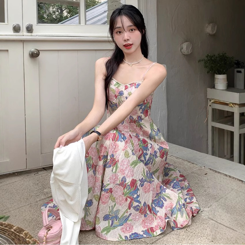 2025 新ティーブレイクフレンチハイエンドシフォンロングスカート油絵花サスペンダードレスツーピーススーツ女性の夏
