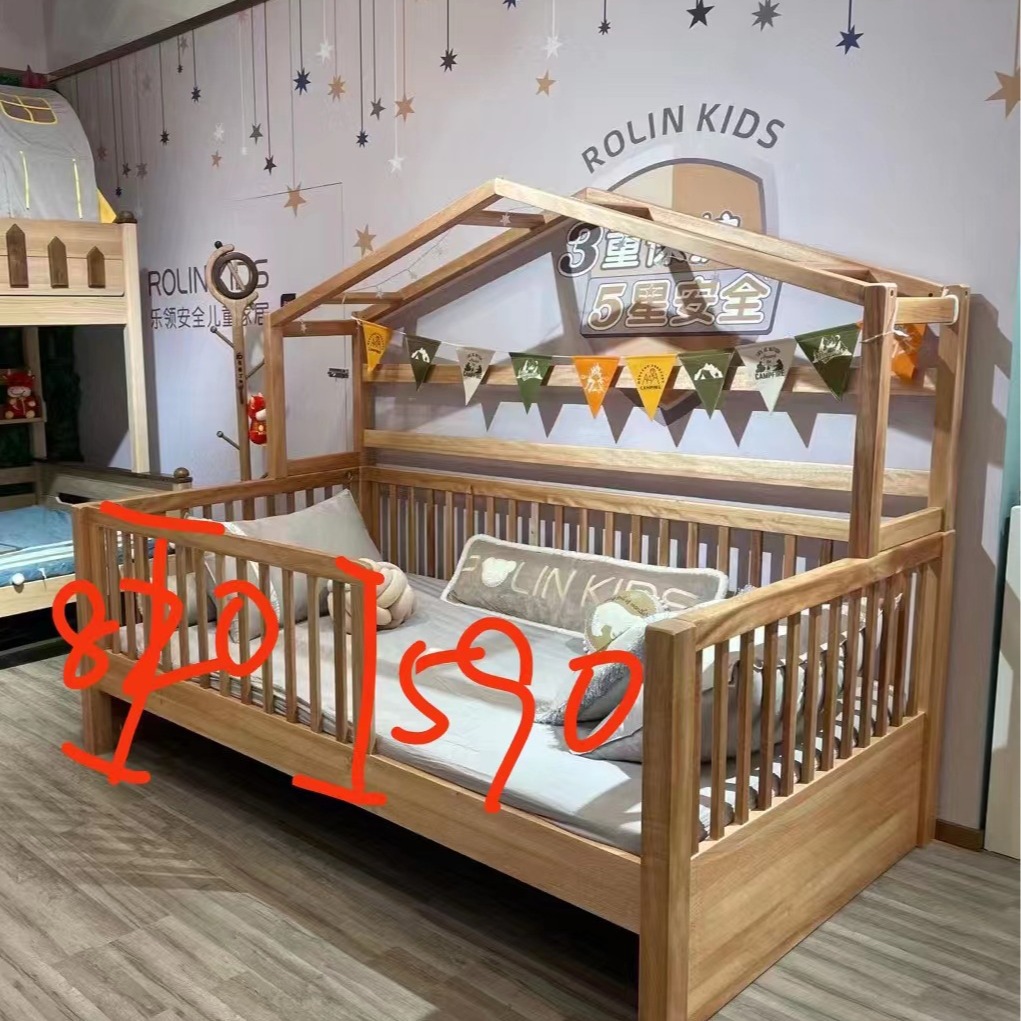 赤い檀木の全実木の子供用ベッドをつなぎ合わせます。子供用ベッドをつなぎ合わせます。子供用ベッドはガードレール付きです。