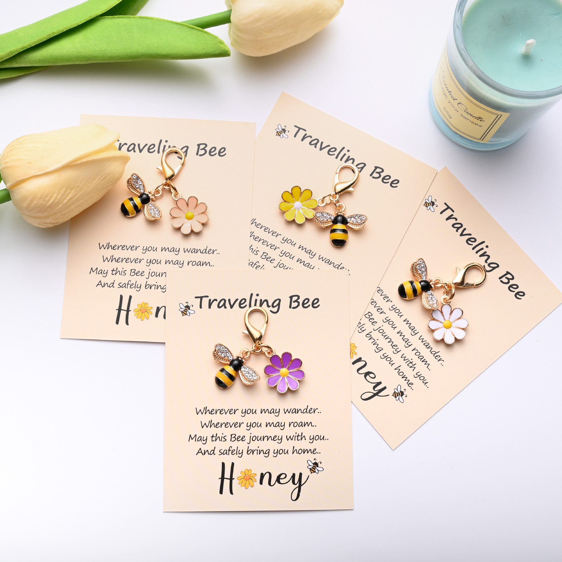 国境を越えて人気のTraveling Bee祝福語カードミツバチの花ストラップのキーホルダー装飾品