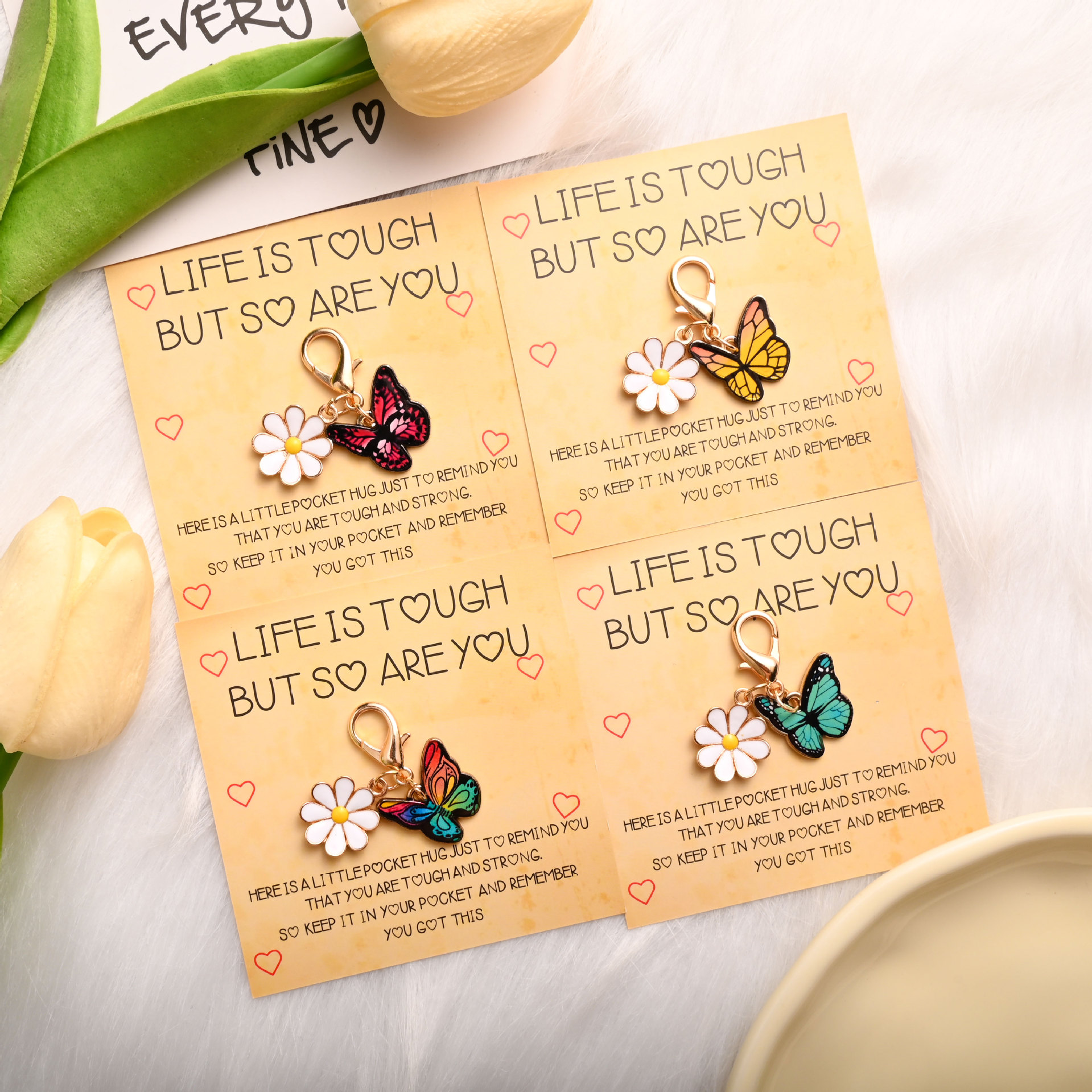 国境を越えた売れ筋英語激励カードクリエイティブカラフルなオイルドリップエナメル蝶の花キーホルダーバッグペンダントアクセサリー