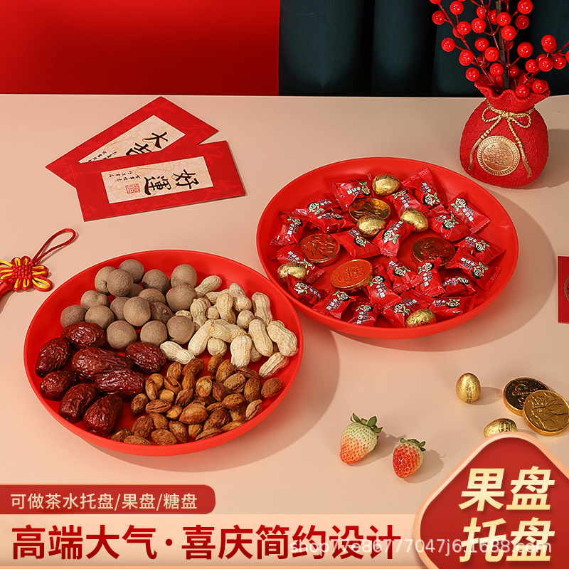赤い皿の喜びの皿のお祝いのトレーの赤い皿の結婚式の用品の果物の皿のプラスチックの皿の丸い形の結婚の喜糖の皿