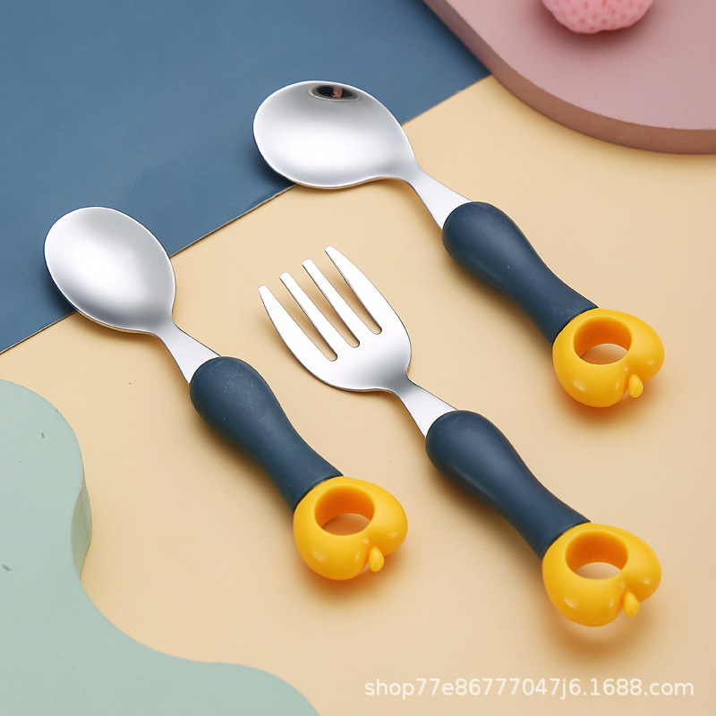 304ステンレスの赤ちゃんの食器の肘のスプーンの3つのセットの補助食品のツールのシリコンのフォークは赤ちゃんを訓練して食事をします。