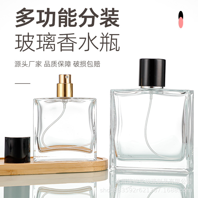 スポット卸売50mlフラットスクエアガラスボトル、厚底ファインミストボトル、スナップボタン式透明ガラス香水詰め替えボトル