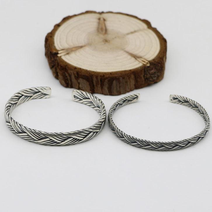 925純銀泰銀麻花編み開口ブレスレット男女手作り個性復古開口純銀活口環