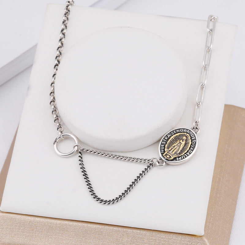 聖母ペンダントネックレス女性円牌泰銀個性復古欧米銀飾り925純銀ファッション百合鎖