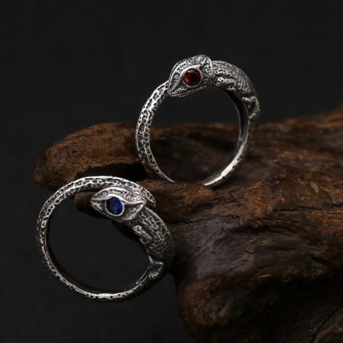 S925純銀の指輪の写実的なカメレオンの指輪はドリル版の男女の口の指輪の復古の泰銀を持って古い尾戒をします。