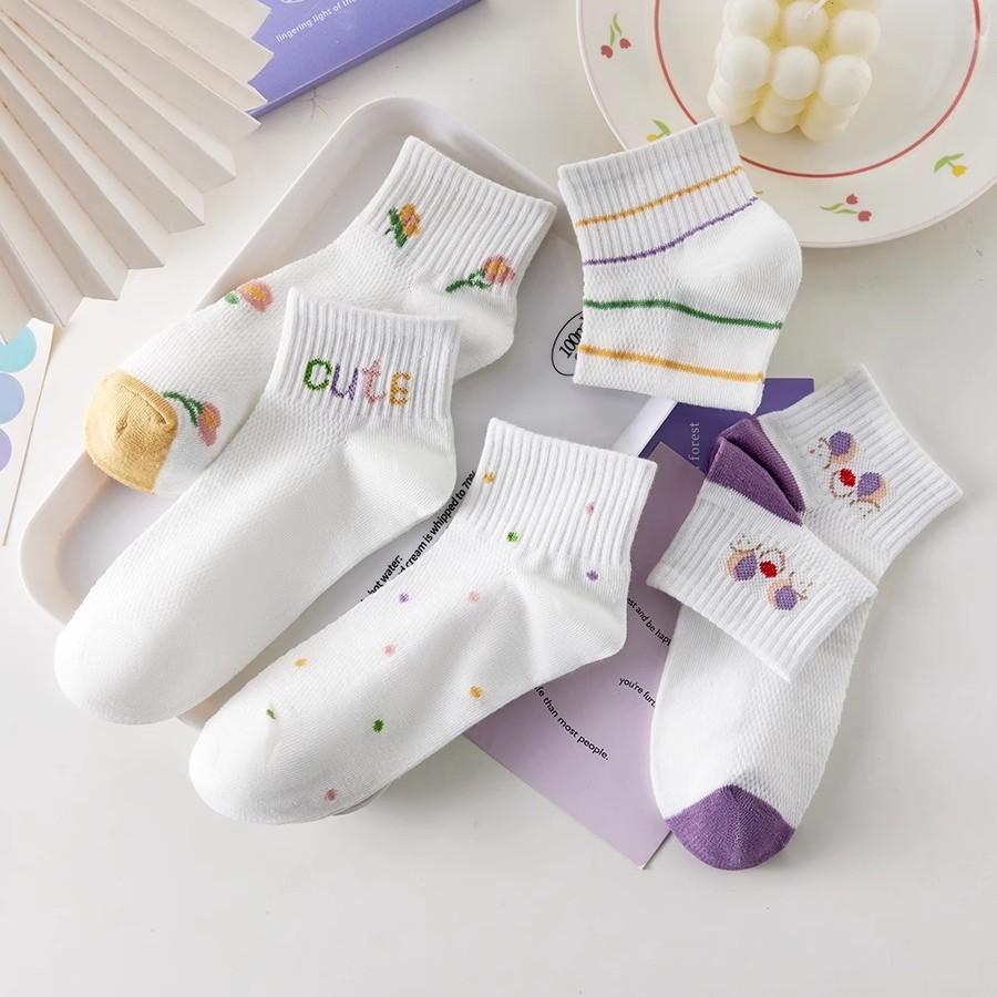 女性用靴下、春夏の薄い非純綿ソックス、吸汗性と通気性のあるメッシュ中空スマイリーフェイス、白い靴と短いチューブ付き