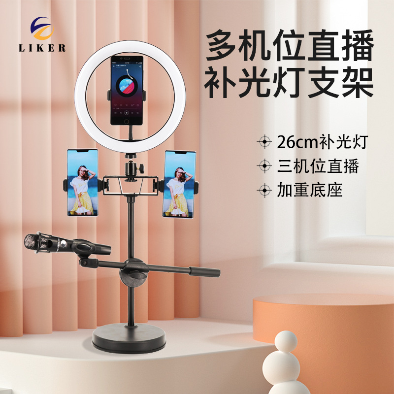 デスクトップ生中継スタンドセット美顔補光スタンド双機位三携帯電話位腹下げスタンドマイク横棒