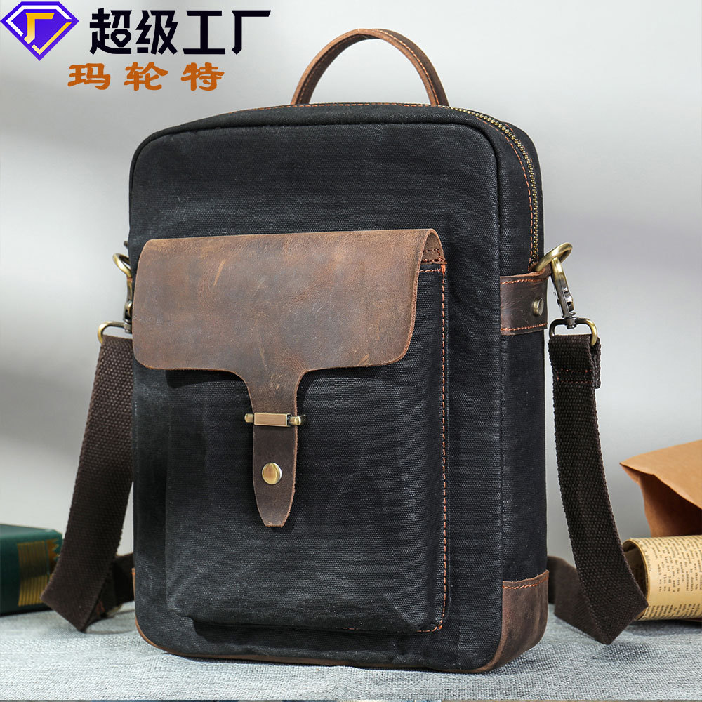 キャンバスとレザーのメンズクロスボディバッグ、高級感のある横型メンズバッグ、カジュアルバッグ、クレイジーホースレザーメンズバッグ、メンズメッセンジャーバッグ