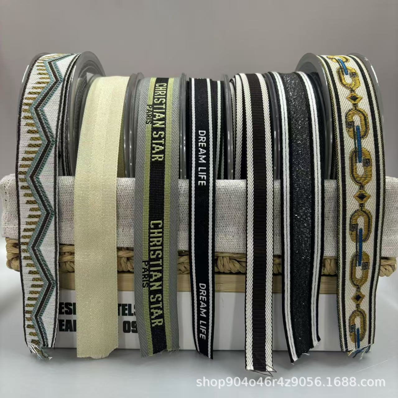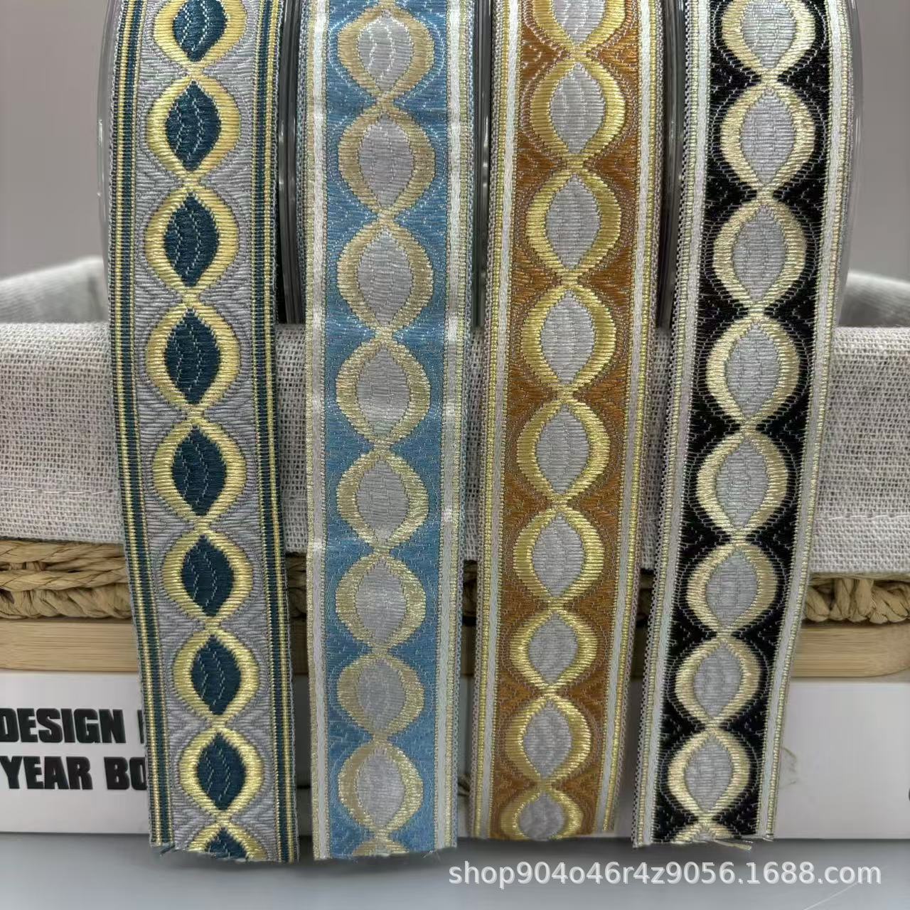 様々なジャカード織りリボン、光沢のある金銀ストライプリボン、衣料品アクセサリー、装飾リボン、DIY縁取り、編み物