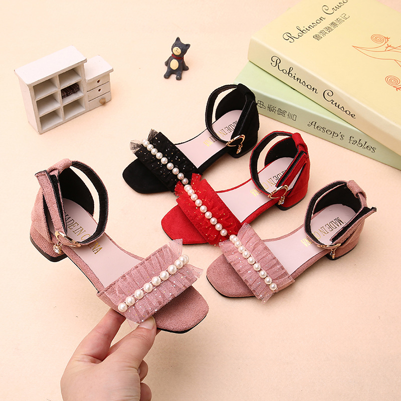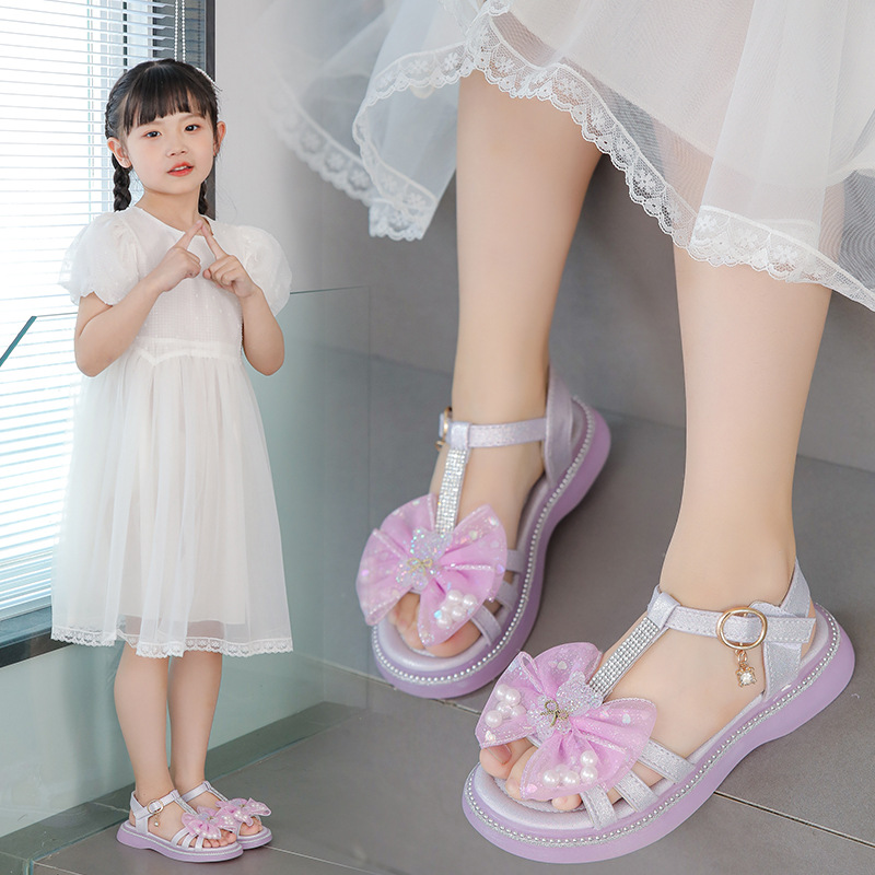 女の子の子供靴ハイヒールのサンダル2024夏の新型の女の子の蝶結びの柔らかい底の露指の王女の靴の大きい子供靴