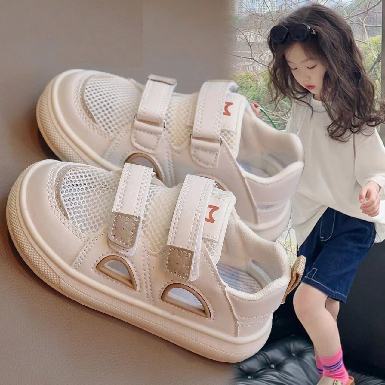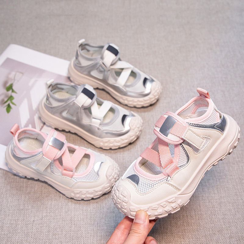 女の子用サンダル2025夏新作中空デザイン子供用白靴つま先が覆われた男の子用スポーツビーチシューズ子供用ネットシューズ