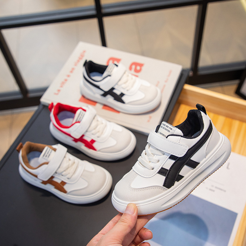 子供の運動靴2024韓国版通気性のある男性の靴春と秋の新型の女の子のお父さんの靴のファッション的な皮の白い靴