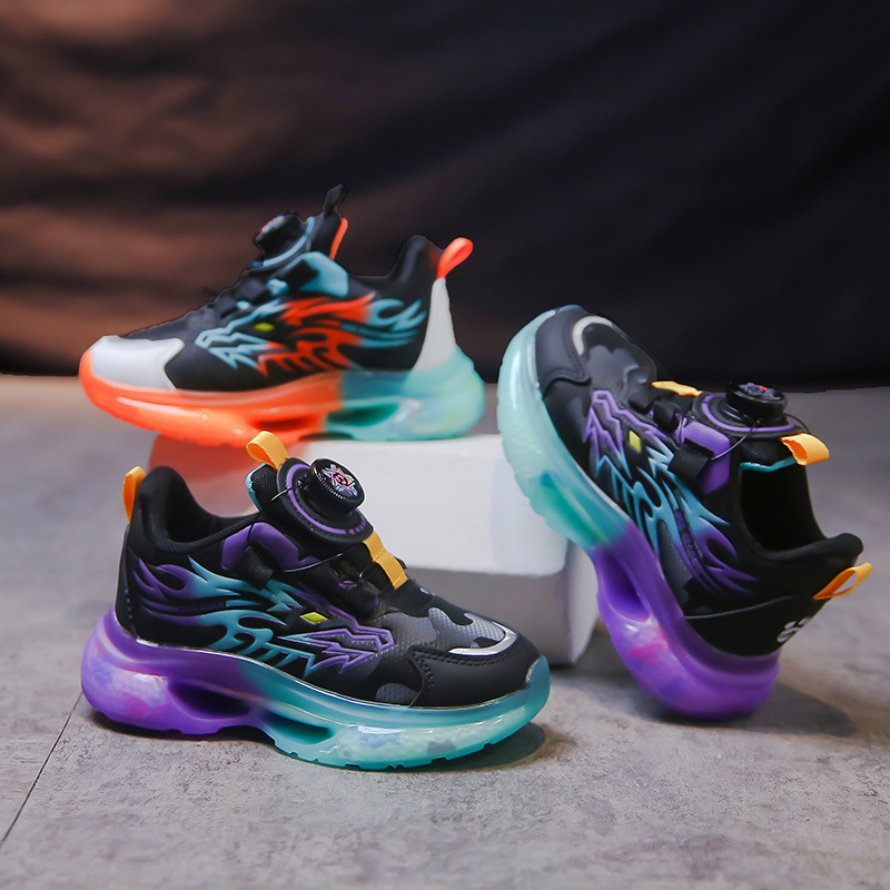 子供用ライト付き運動靴2025年と秋の新型回転ボタンネットの通気性が光る女の子アニメのランニングシューズ