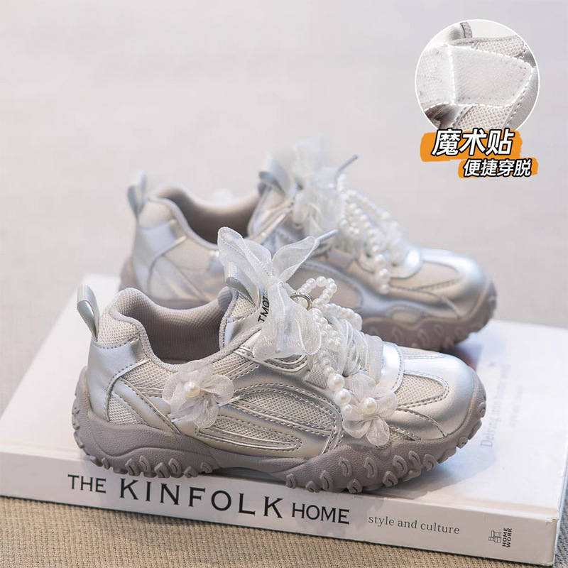 潮牌児童スポーツシューズ2025春夏の新型洋気百合滑り止めストラップネット通気ランニングシューズ