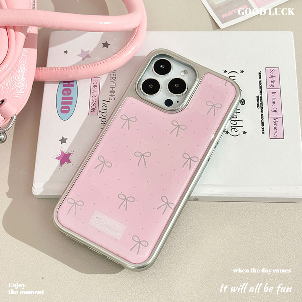 新しいかわいいリボン iPhone16 保護カバー 14pm 携帯電話ケース ガール ピンク Apple 15 シルバー エッジ接着剤