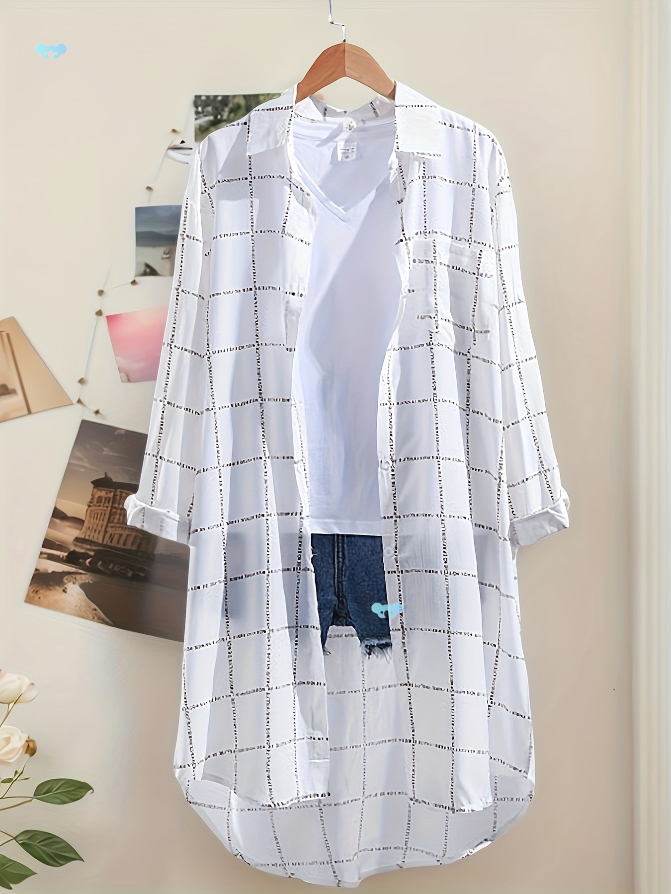 レディース ホワイト チェック プリント 長袖シャツ 軽量