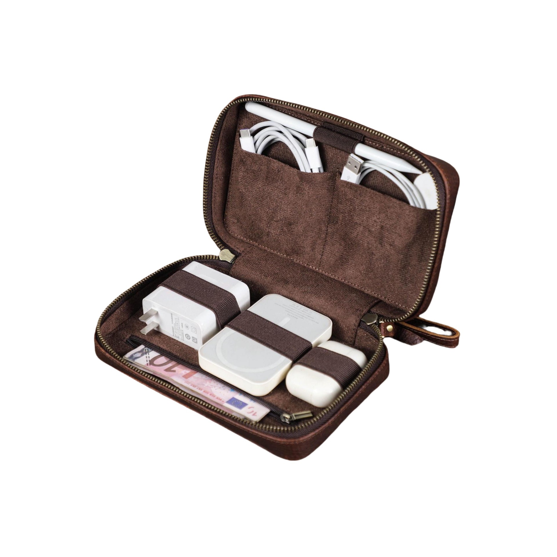 ヨーロッパとアメリカの第一層牛革リストパワーバンク収納袋レトロレザーデータケーブルバッグ携帯電話バッグ男性と女性用