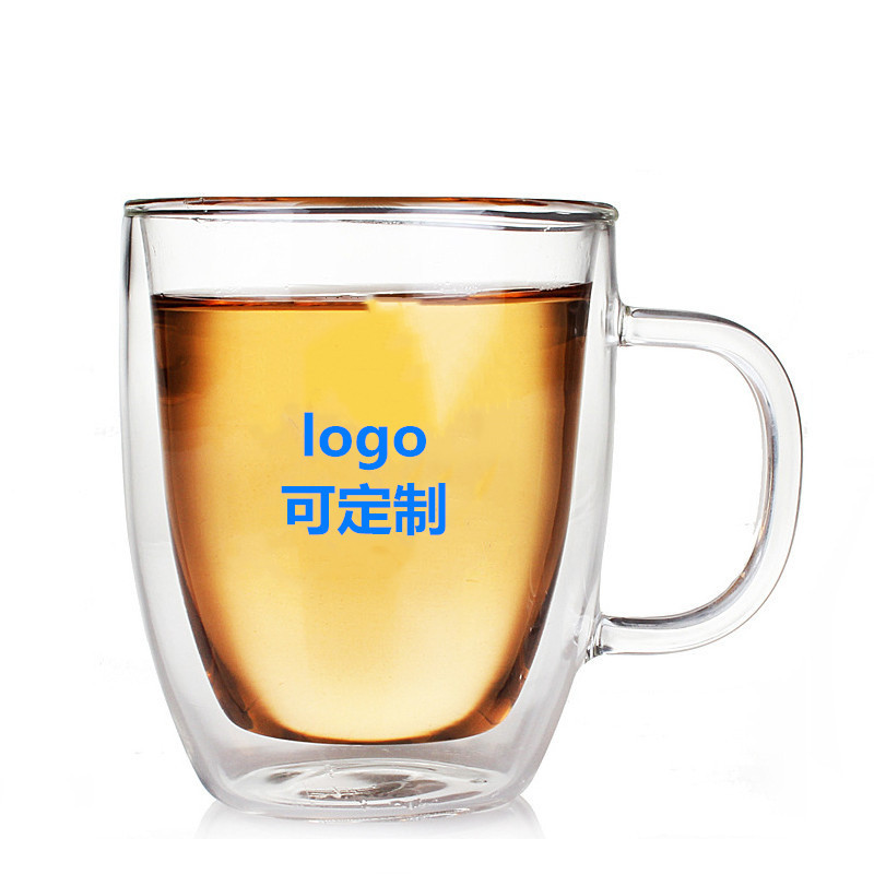 メーカー在庫あり、クリエイティブな透明なハンドル付きガラスウォーターカップ、断熱コーヒーティーカップ、二重層ジュースミルクカップ、ハンドヘルド