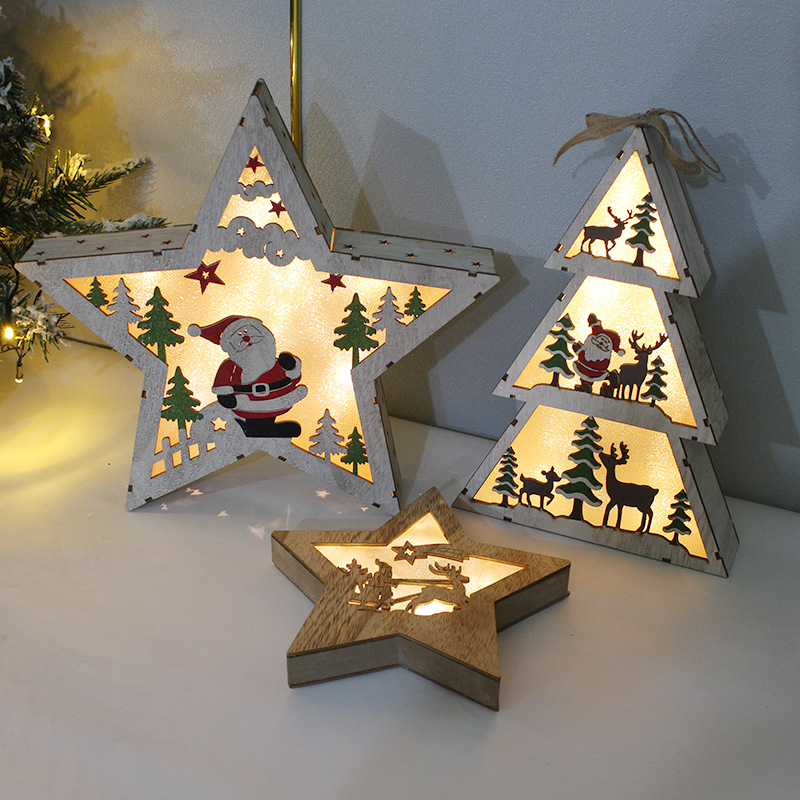 クリスマスの装飾品が光る木製の五芒星を特別価格で販売しています。