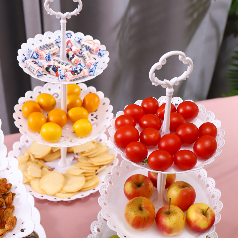 ヨーロッパ式のプラスチックの多層の果物の皿の客間のお茶のいくつかのキャンディーの皿の前のケーキの棚のトレーの3階のデザートの台の置物