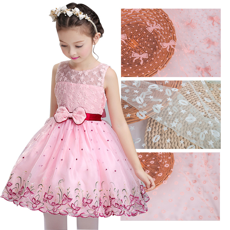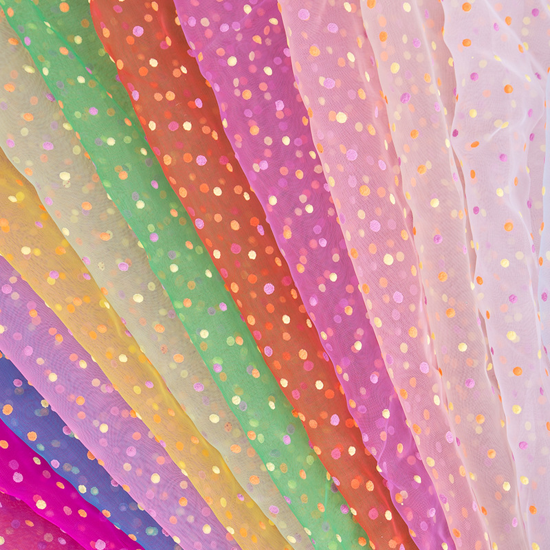 ポリエステルカラーの丸い点の欧根紗のプリントの布地の頭飾りの蝶結びのスカートの演出服の子供服の布地