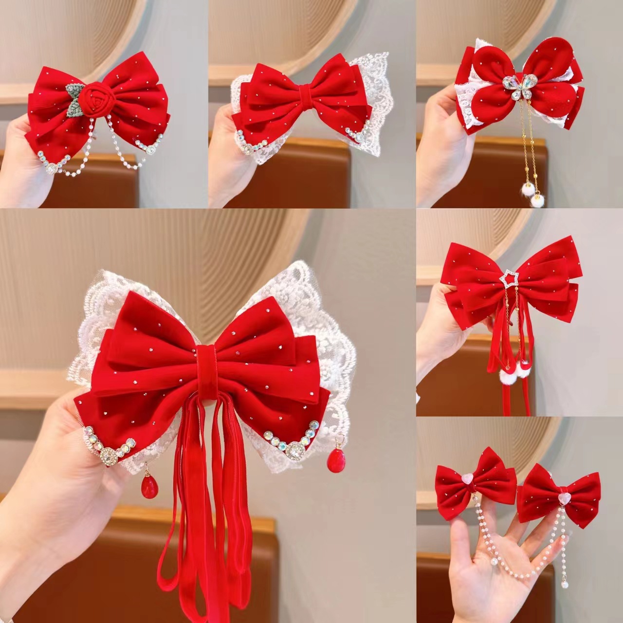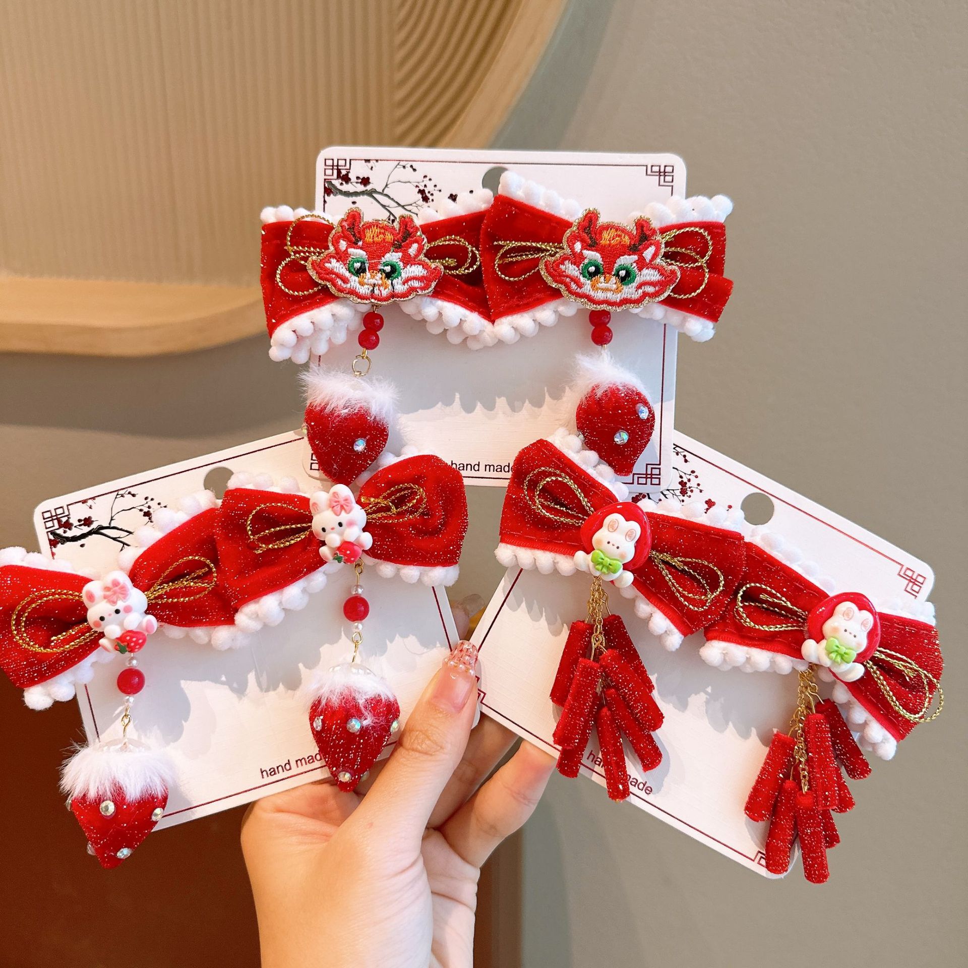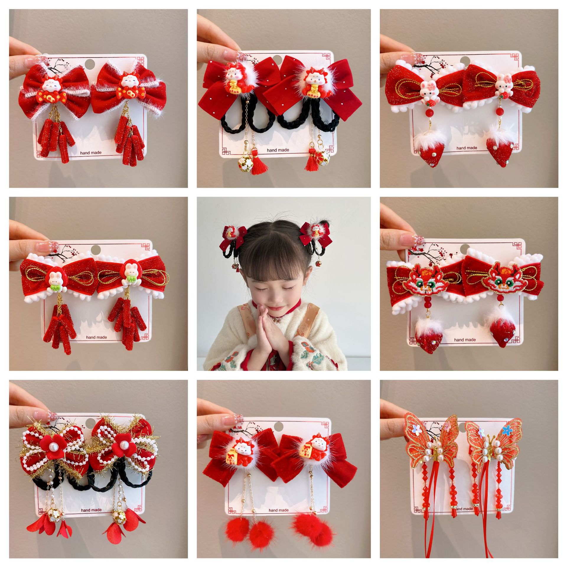新年のヘアピンの女の子のお祝いの新年のぬいぐるみのヘアピンの女の子の蝶結びの髪飾りの古風な漢服の赤ちゃんの髪飾り