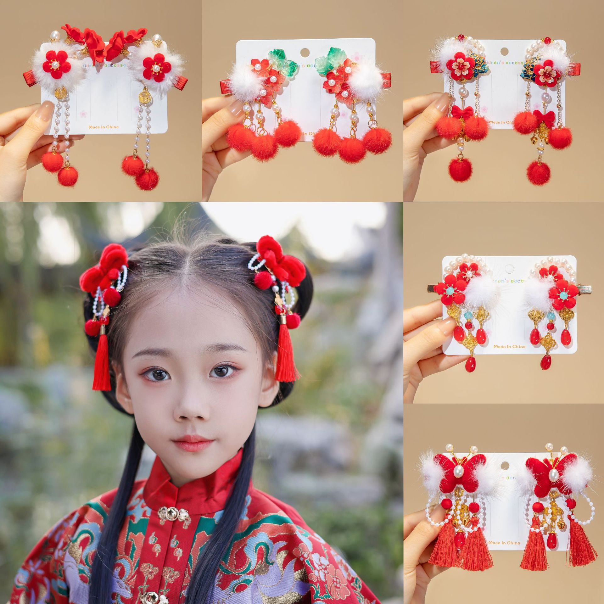 新年の赤い髪飾り古風流蘇毛玉ヘアピン漢服ヘアピン少女中国風新年おめでとう髪飾り