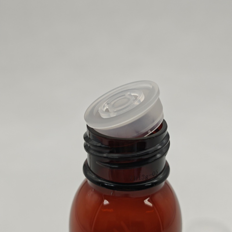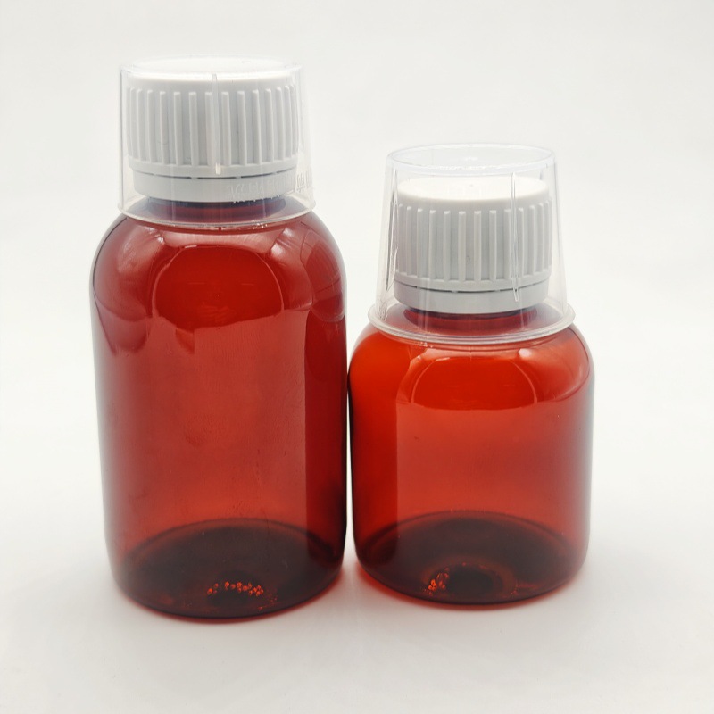 スポット卸売 60 ミリリットル透明経口液体シロップボトル PET 保険カバー茶色のプラスチックボトル液体詰め替えボトル