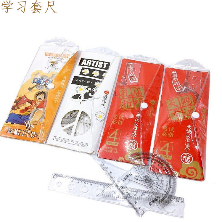 新型シンプル透明カバー定規学生四点セット物差しセット学習文房具用品卸売り
